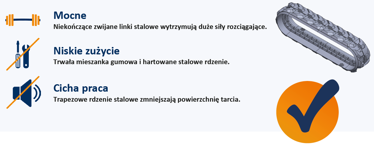 - Wytrzymałe, nierdzewne linki stalowe zwiększają odporność na zużycie i zapewniają długą żywotność gumowych gąsienic.